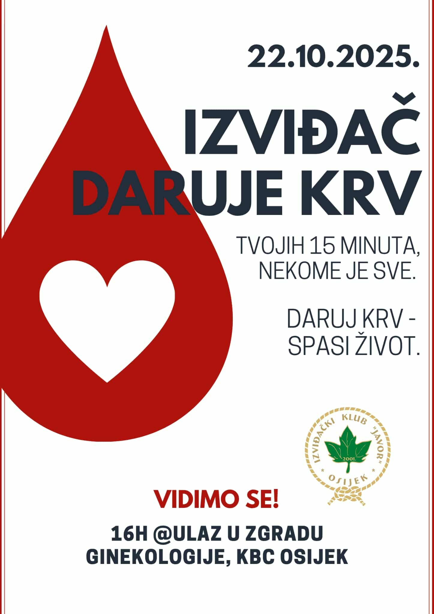 Pozivamo sve punoljetne članove i sve one koji žele dati krv da nam se pridruže na izviđačkoj aktivnosti IZVIĐAČ darije krv- daruj je i TI. Vidimo se 22.10.2025. ispred ulaza u ginekologiju