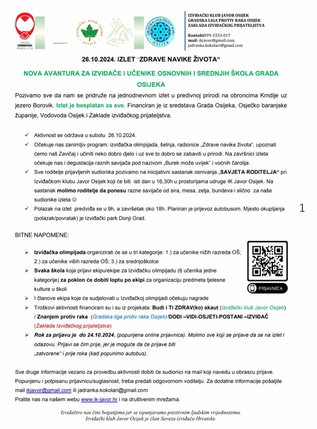 Ovaj izlet je besplatan za sve, a osiguran je putem projekata Izviđačkog kluba Javor Osijek, Gradske lige protiv raka Osijek i Zaklade izviđačkog prijateljstva.